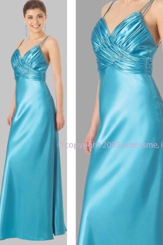 This stunning turquoise gown has a deep v-neckline, spaghetti straps, and a pleated bodice and empire waist. The sleek charmeuse fabric will flatter your curves, while flowing around the feet.