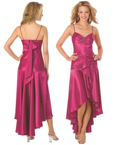 This sexy dress is perfect for the upcoming warm months. With a scalloped bodice and ruched drop waist, the asymmetrical ruffled hemline has a tango dance feel to it. The colored rhinestone pendant adds a nice touch of sparkle to this red hot gown.