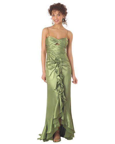 This stunning citrine gown has a pleated crossed sweetheart bodice with a flirty keyhole detail. The ruched empire waist will cinch your figure. The sexy ruffle drape spills out to the asymmetrical layered hemline for an overall come hither look.